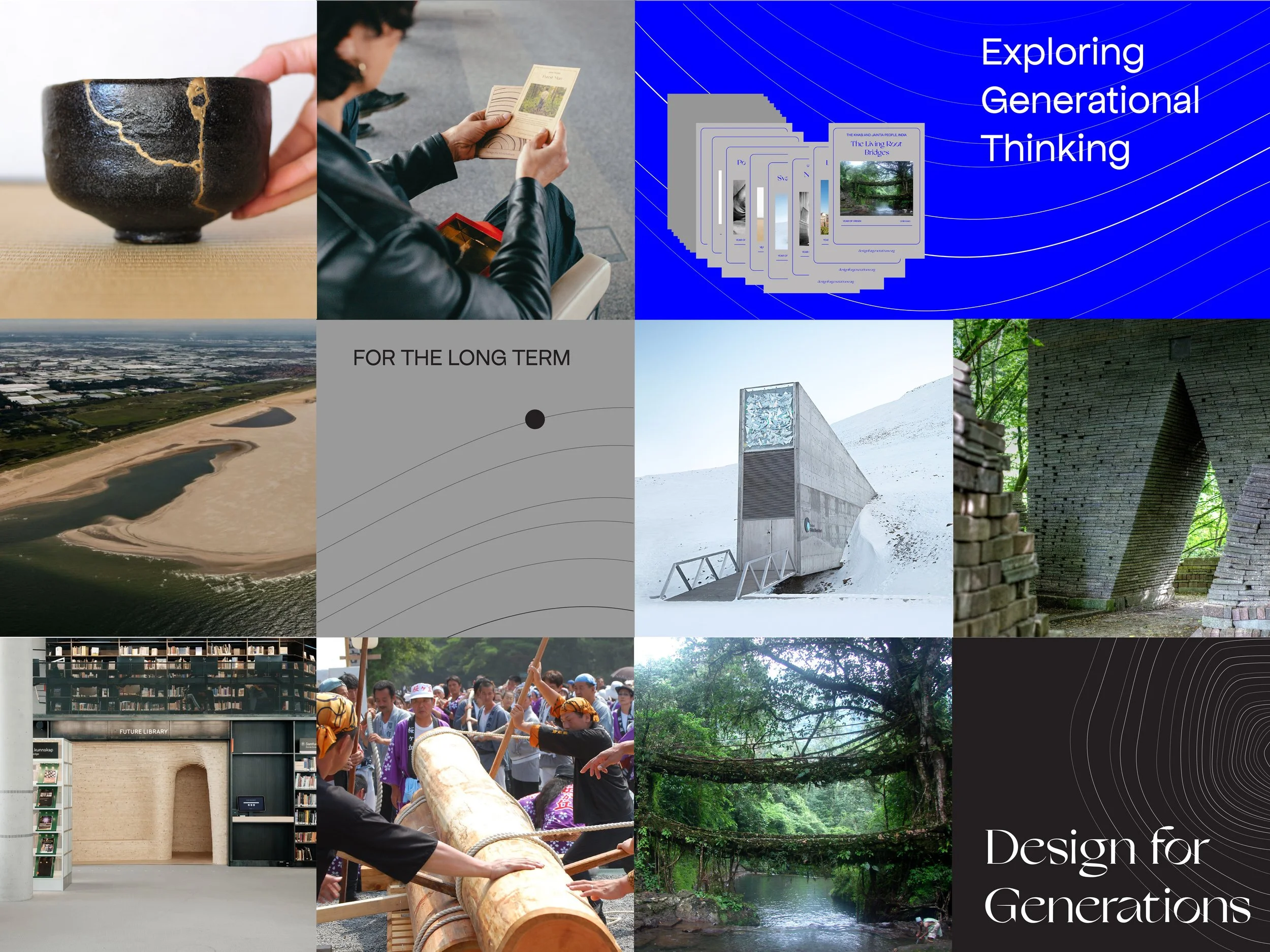 De DfG collectie bevat een verzameling concepten en projecten die intergenerationeel denken omarmen – van architectuur tot gebruiksvoorwerp, van ritueel tot vaardigheid. Deze voorbeelden gaat soms al eeuwen lang mee. Een eeuwenoud voorbeeld is bijvoorbeeld de Living Root Bridge in India, in de collectie staat deze zij aan zij met moderne voorbeelden zoals de Svalbard Seed Vault. Allen ontwikkeld met respect voor het verleden en de toekomst.